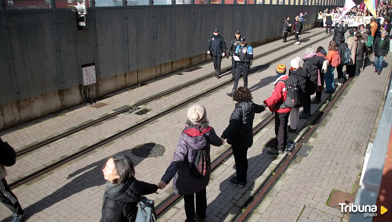 La cadena humana ha transitado por los dos kilómetros de vías entre el apeadero de la Asunción y la estación de Matallana y que nunca fueron estrenadas. Los últimos planes de Adif y el Ministerio de Transportes pasan por enterrar esas vías y solucionar con autobuses eléctricos el problema de la llegada al centro desde el apeadero de la Asunción, tal y como informaba el administrador ferroviario esta semana en un comunicado.